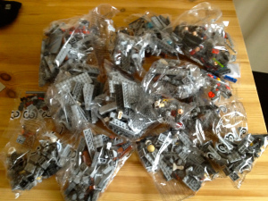 When I got it home and cracked it open, I was surprised to see four sub-boxes inside. Most Lego sets come in the equivalent of one of these. I had considered buying my Death Star on a recent trip to New York, where it’s considerably cheaper (Lego says this is because of shipping costs and variations in exchange rates between the Canadian dollar and Danish kroner), but I’m glad I didn’t. I’d brought luggage with me specifically to pack the pieces, but in retrospect it was clear I had horribly misjudged how much space they’d take up.